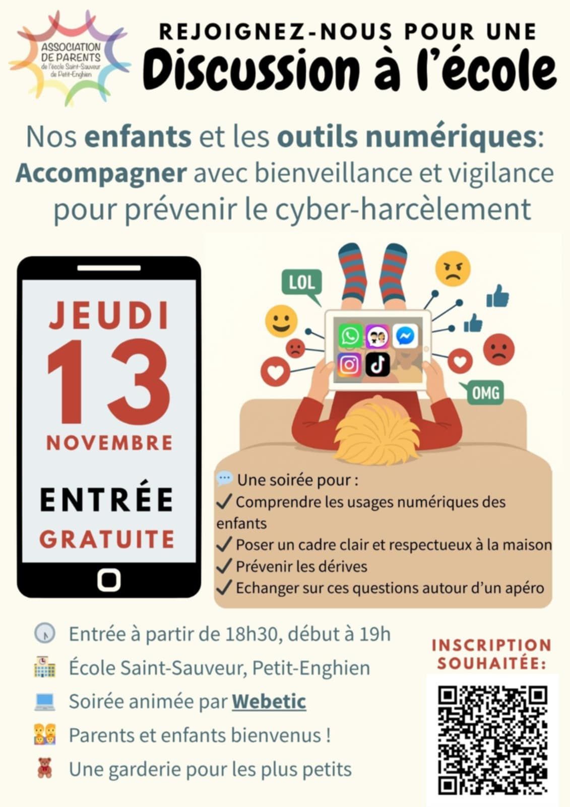 Dans le cadre de la semaine HOPE , initiative nationale de sensibilisation contre le harcèlement scolaire , l’Association de Parents et l’équipe éducative de l’école Saint-Sauveur ont le plaisir de vous inviter à une séance interactive le jeudi 13 novembre à partir de 18h30, à l’école Saint-Sauveur de Petit-Enghien . Thème : "Nos enfants et les outils numériques : accompagner avec bienveillance et vigilance pour prévenir le cyber-harcèlement" - Soirée animée par l’équipe de Webetic – Ligue des Familles & Child Focus Cette soirée s’adresse à tous les parents, éducateurs, adultes qui souhaitent mieux comprendre comment soutenir leur(s) enfant(s) de la P1 à la P6 dans un usage sain et sécurisé du numérique MAIS AUSSI aux enfants qui le souhaitent : réseaux sociaux, jeux en ligne, messageries… autant d’espaces où peuvent naître des situations de harcèlement ou de mal-être Au programme : - 18h30 : Accueil, petit verre et installation - 19h00 : Animation par Webetic (Conseils pratiques pour instaurer un cadre équilibré à la maison Réflexes à adopter face aux dérives : cyberharcèlement, surexposition, manque de respect ) - 20h00 : Échanges ouverts et réponses à vos questions Les enfants qui souhaitent participer à la discussion sont les bienvenus . Pour les plus petits, un local encadré par de jeunes baby-sitters sera préparé pour les accueillir. En participant à cette conférence, vous contribuez à renforcer le dialogue et la prévention autour du harcèlement scolaire et du numérique . Nous espérons vous y voir nombreux ! Inscription via le lien suivant : https://docs.google.com/.../1FAIpQLScajK3A3WKPNW.../viewform