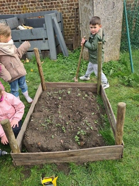 Au programme : Préparer le sol, le nourrir, semer (radis, courgettes, salades), arroser, mesurer, couper, visser, … tout est sous contrôle grâce à l’intervention efficace de Jean-Michel, notre ancien élève devenu papa de l’école, que nous remercions pour son temps et ses conseils !